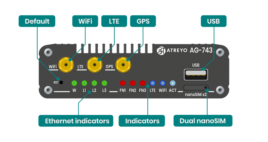 The AG-743 gateway has 10 indicators on the front panel. By default, they are programmed to perform certain functions, but they are all controlled by the processor and knowing the OpenWRT system well, change their functions. The LAN indicators are also located on the front panel.