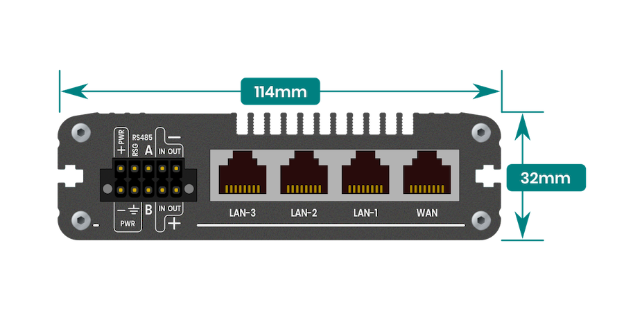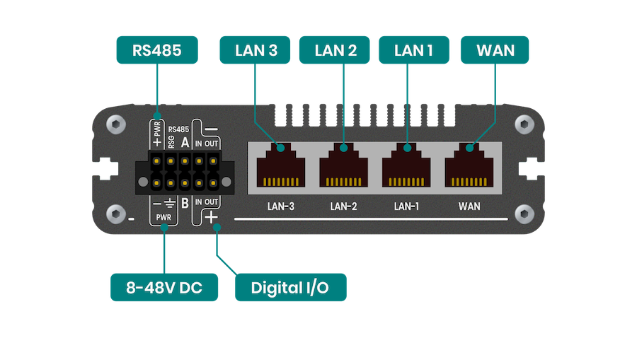 The gateway has four RJ45 ethernet ports with LED indicators on front. The speed of each is 100Mbps. Three are configured as LAN and one as WAN. WAN supports PoE on free RJ45 pairs.