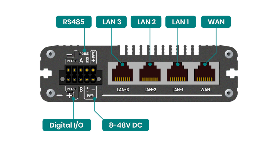 The gateway has four RJ45 ethernet ports with LED indicators on front. The speed of each is 100Mbps. Three are configured as LAN and one as WAN. WAN supports PoE on free RJ45 pairs.