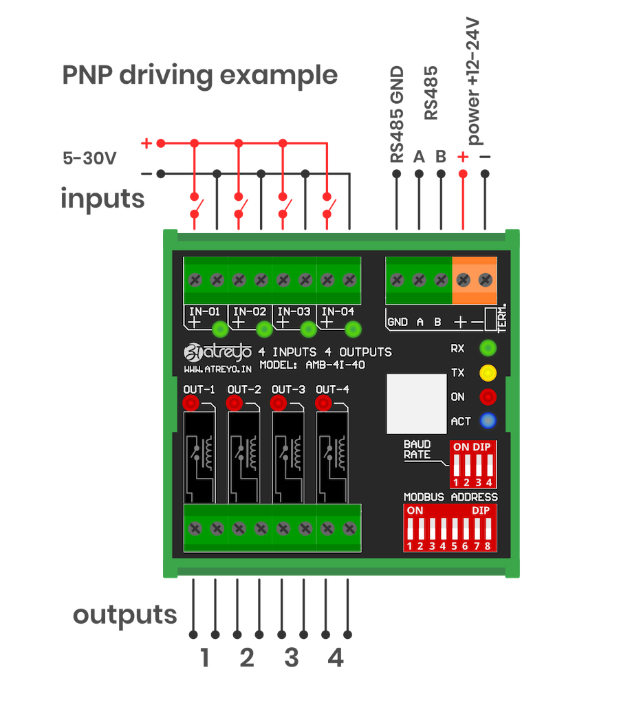 User can set the slave ID address using 8 Bit DIP switch found on board. This allow 0 to 255 different IDs to be set. The number below the switches are added together and the result will be identifier of the device slave ID.