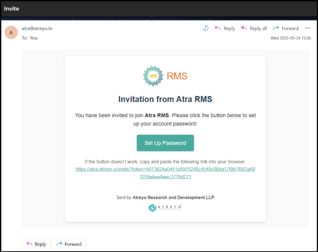 This email is sent when you are invited to join the Atra-RMS platform. It contains a secure link that allows you to set up your new account.