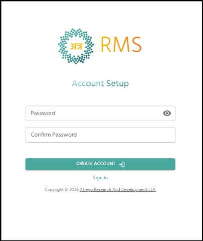 This page allows you to create a password for your new Atra-RMS account after clicking the setup link from your invitation email.