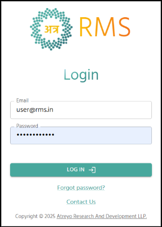 Enter your registered email address (e.g.,user@rms.in) in the top field. - 🔑 Password: