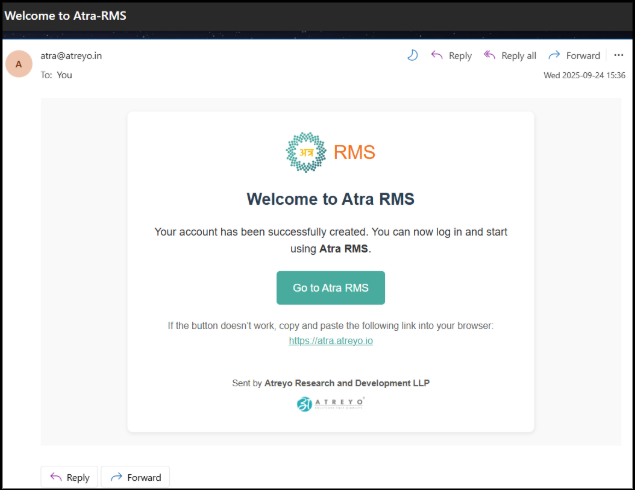 "Your account has been successfully created. You can now log in and start using Atra RMS."