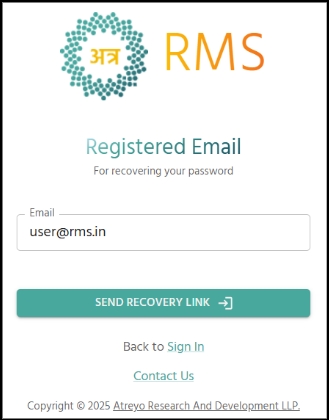 Type the registered email address associated with your Atra-RMS account into the Email field. - 📤 Send Recovery Link: