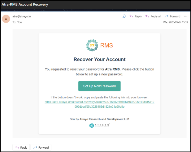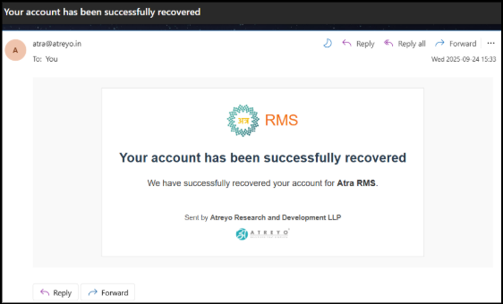 The email — titled “Atra-RMS Account Recovery” — confirms your request to reset the password for your Atra-RMS account.
