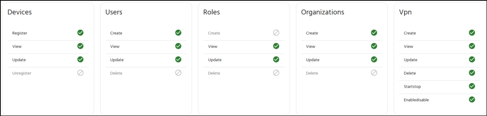 The page displays all five section cards (Devices, Users, Roles, Organizations, VPN) with their respective permissions, clearly indicating which actions are allowed (✓) and which are not allowed (◯) for the role.