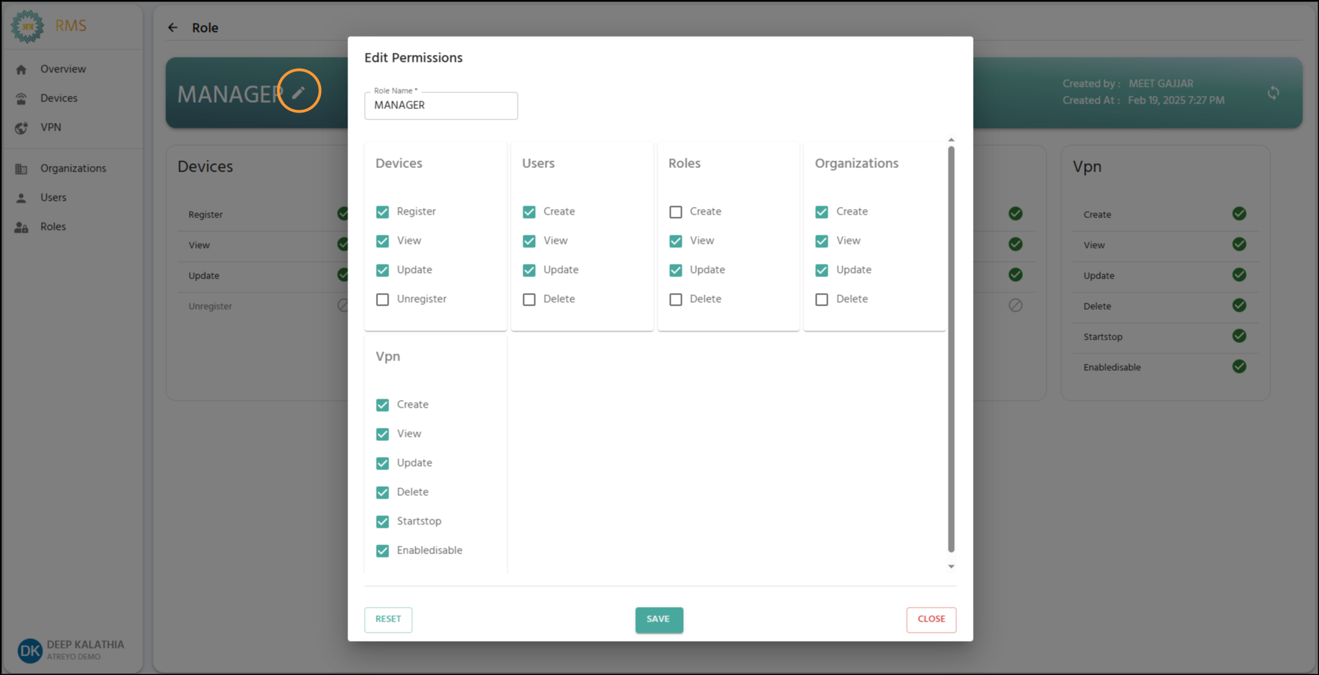 RESET (Teal Outline): Reverts all changes made since the dialog box was opened, restoring the permissions and name to their last saved state.