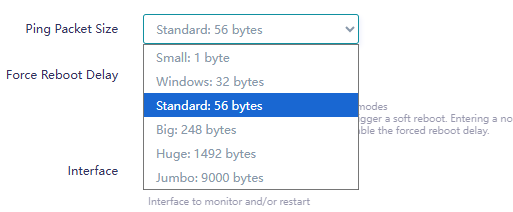 - Interface - The interface to ping via, and also, in Restart Interface mode the one to restart. If unset, it will use the default route's interface